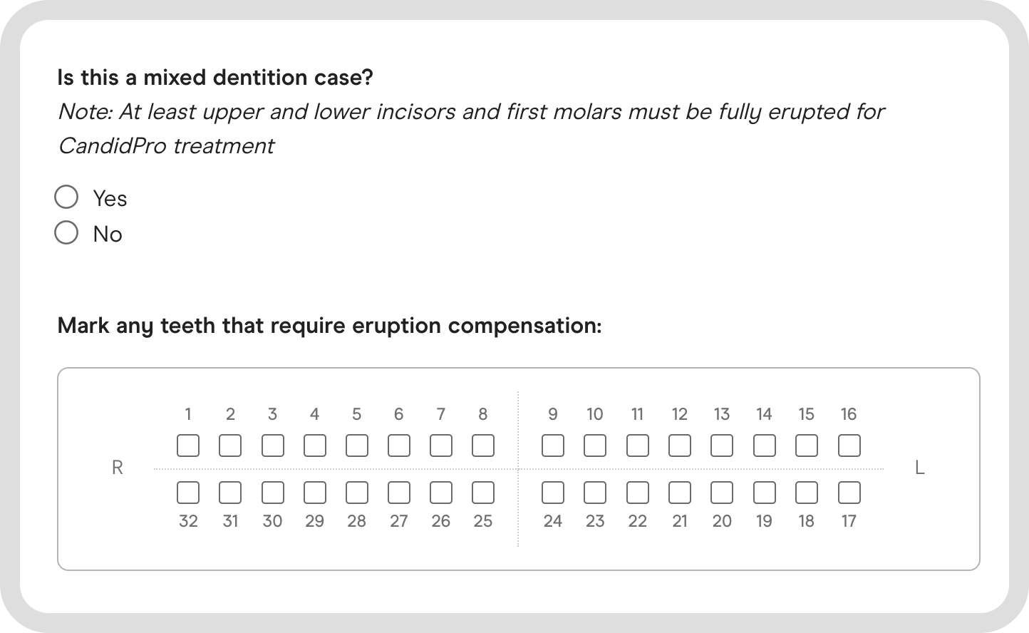 We've kept the case submission flow largely the same in an effort to keep it efficient and easy to use. The core difference is that you’ll now notice two new questions under the "Treatment goals" section pertaining to mixed dentition. The first allows for you to indicate whether or not your patient has mixed dentition and the second provides a grid to highlight if any teeth require eruption compensation. Aside from these, your case submission flow does not change.