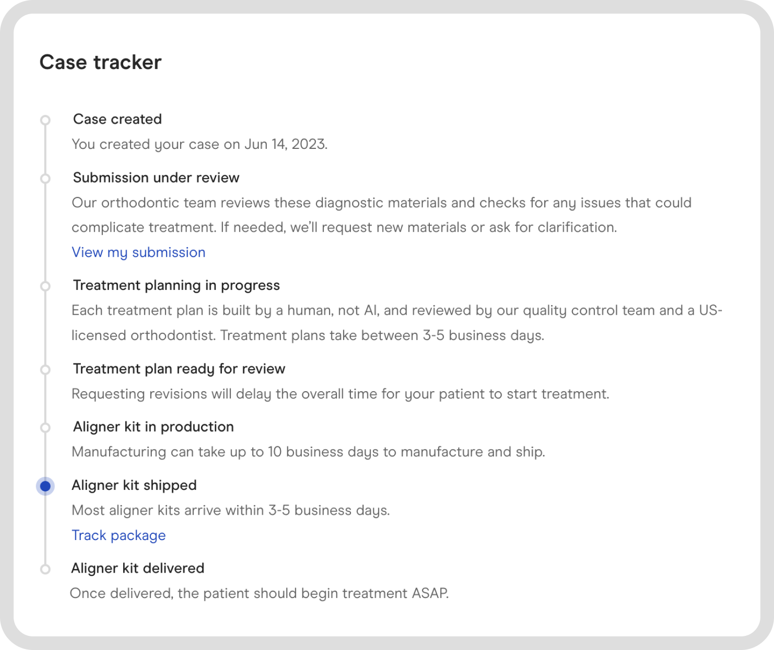 Aligner kit shipped: Aligner kit has officially shipped (either to your patient or your office, depending on your selection).