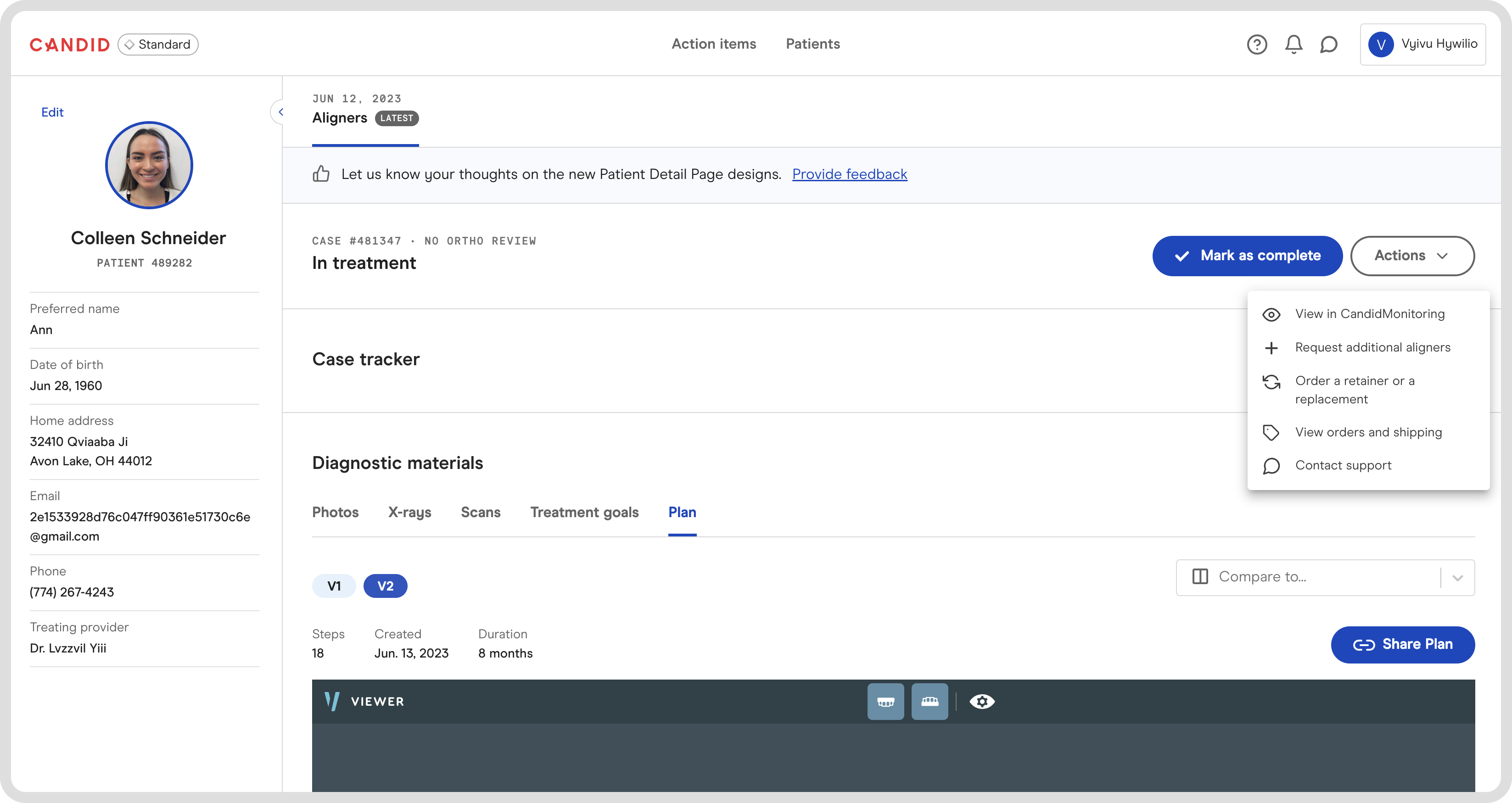 Actions: All of the actions you may want to take on your case (viewing CandidMonitoring, requesting additional aligners, ordering retainers, etc.) are now organized in a single location within the "Actions" drop down.