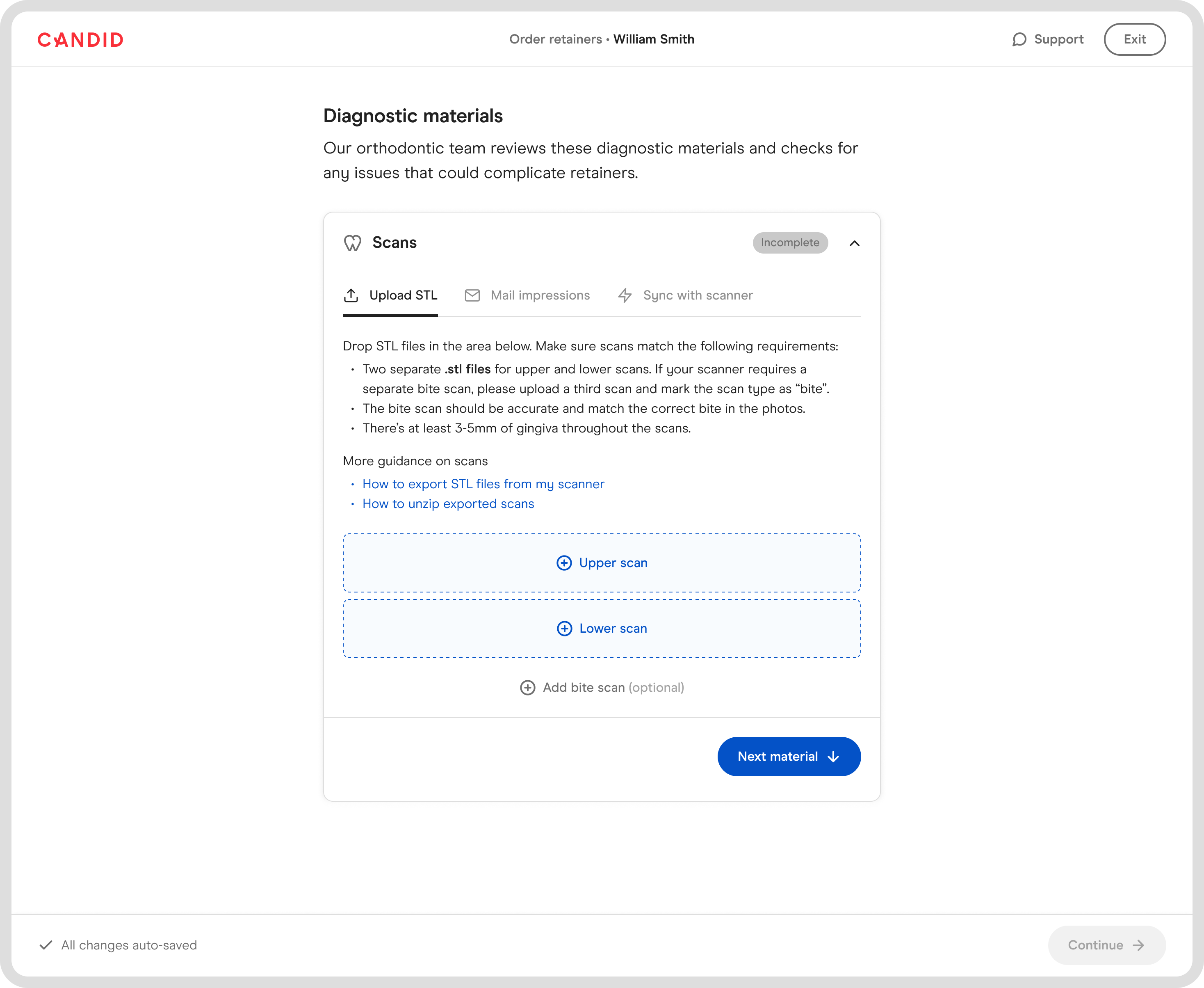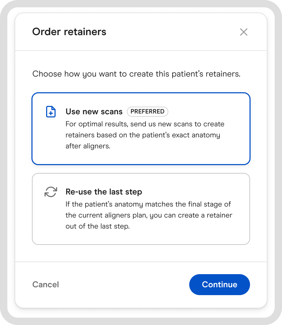 Clicking on the “Use new scans” option will prompt you to upload new materials for your patient so that we can create retainers based on the most up to date information about their bite.